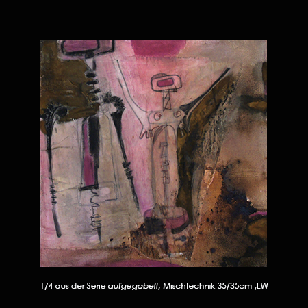 Menschen ohne Bezug zur Malerin oder zueinander treten in eine fiktive Beziehung. Gegenstände, scheinbar wahllos der Schublade entnommen, werden im Bild inszeniert, Formen oder Formbruchstücke werden zum Thema und mit neuen Assoziationen belegt. Mensch und Gegenstand gehen neue Verbindungen ein und ermöglichen ein freies Spiel mit Formen und Farbe.